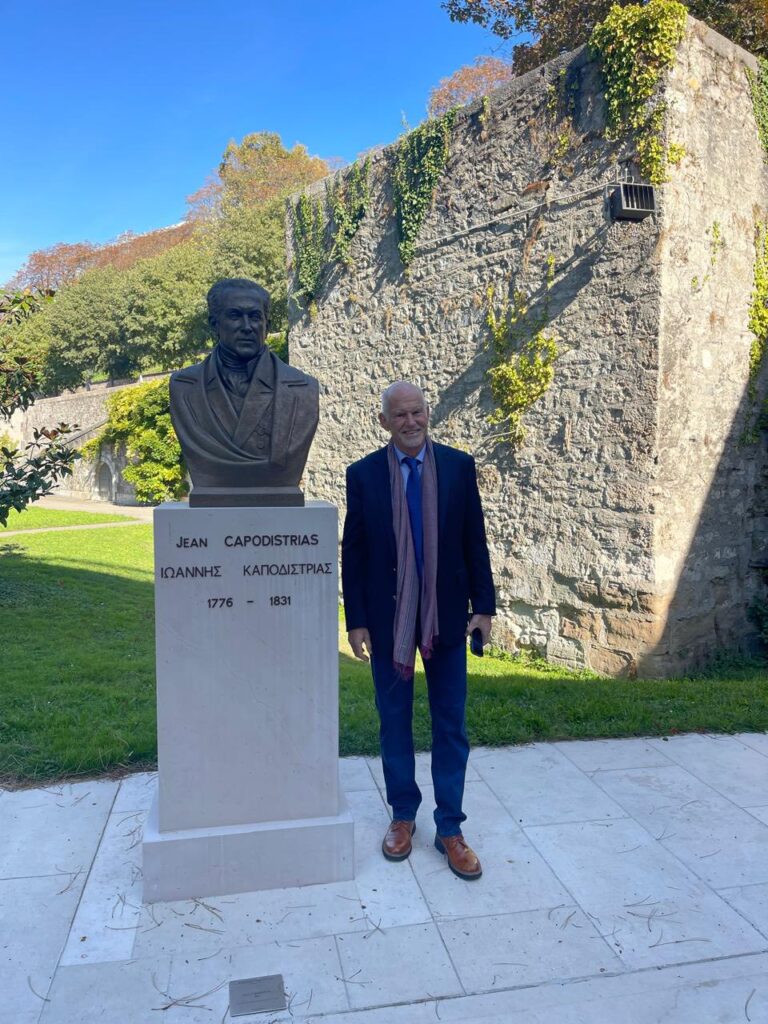 Ιδιαίτερη στιγμή της επίσκεψης αποτέλεσε η αναφορά στην προτομή του Ιωάννη Καποδίστρια, δωρεά του Ελληνισμού, που συμβολίζει τη μακραίωνη φιλελληνική παράδοση της Γενεύης και τη συμβολή του Καποδίστρια στην ενότητα και ανεξαρτησία της Ελβετίας, καθώς και τους στενούς δεσμούς φιλίας Ελλάδας–Ελβετίας.
