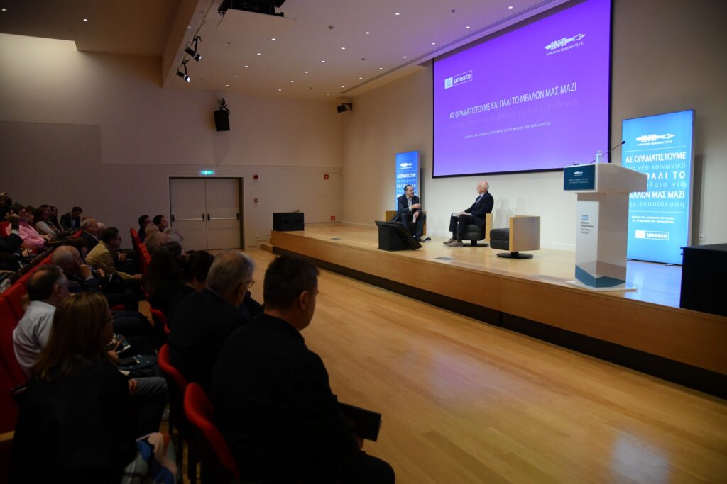 Στο πλαίσιο της χθεσινής επίσημης παρουσίασης της ελληνικής έκδοσης της Έκθεσης της UNESCO «Ας Οραματιστούμε και πάλι το Μέλλον μας Μαζί: Ένα Νέο Κοινωνικό Συμβόλαιο για την Εκπαίδευση», ο Γιώργος Α. Παπανδρέου συνομίλησε με τον Παύλο Τσίμα γύρω από τα κεντρικά ζητήματα που αναδεικνύει η Έκθεση, τόσο σε διεθνές επίπεδο όσο και για τη χώρα μας.